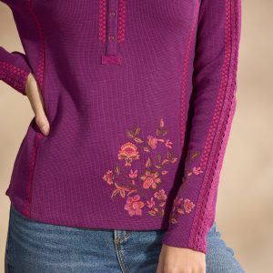 So flattering. our mock neck henley is blooming with stunning. multi colored floral embroidery. feminine lace insets at the sleeves and metal snaps at the placket. Princess seams. Cotton. Machine wash. Imported. Exclusive. Sizes XS (0–2). S (4–6). M (8–10). L (12–14). XL (16–18). XXL (20–22). Approx. 25l.