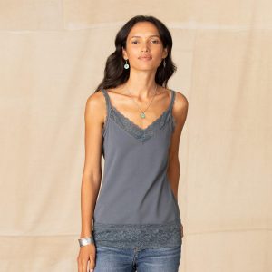 An everyday essential with the most beautiful lace at V-neck. shoulder straps and hem. Stretchy and soft. it makes the perfect underlayer. Supima cotton/spandex. Machine wash. Imported. Exclusive. Sizes XXS (00). XS (0?C2). S (4?C6). M (8?C10). L (12?C14). XL (16?C18). Approx. 24l.