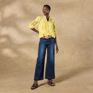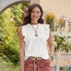 Patchworks of lace. delicate Chantilly and bold Venetian. intersperse with silky. windowpane fabric bringing texture and grace to a blouse with billowing sleeves and crocheted lace trim. Coordinating camisole with adjustable straps. Viscose/cotton. Hand wash. Imported. Exclusive. Sizes XS (2). S (4-6). M. (8-10). L (12-14). XL (16-18). XXL (20-22). Approx. 25.5l.