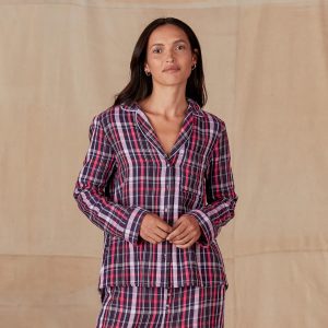 Soft and feminine plaid pajama top sure to delight with fabric covered buttons down the front. one patch pocket and lace trim detail. Hi-lo hem. Cotton. Machine wash. Imported. Exclusive. Sizes XS (0-2). S (4-6). M (8-10). L (12-14). XL (16-18). XXL (20-22). Approx. 25.5l.