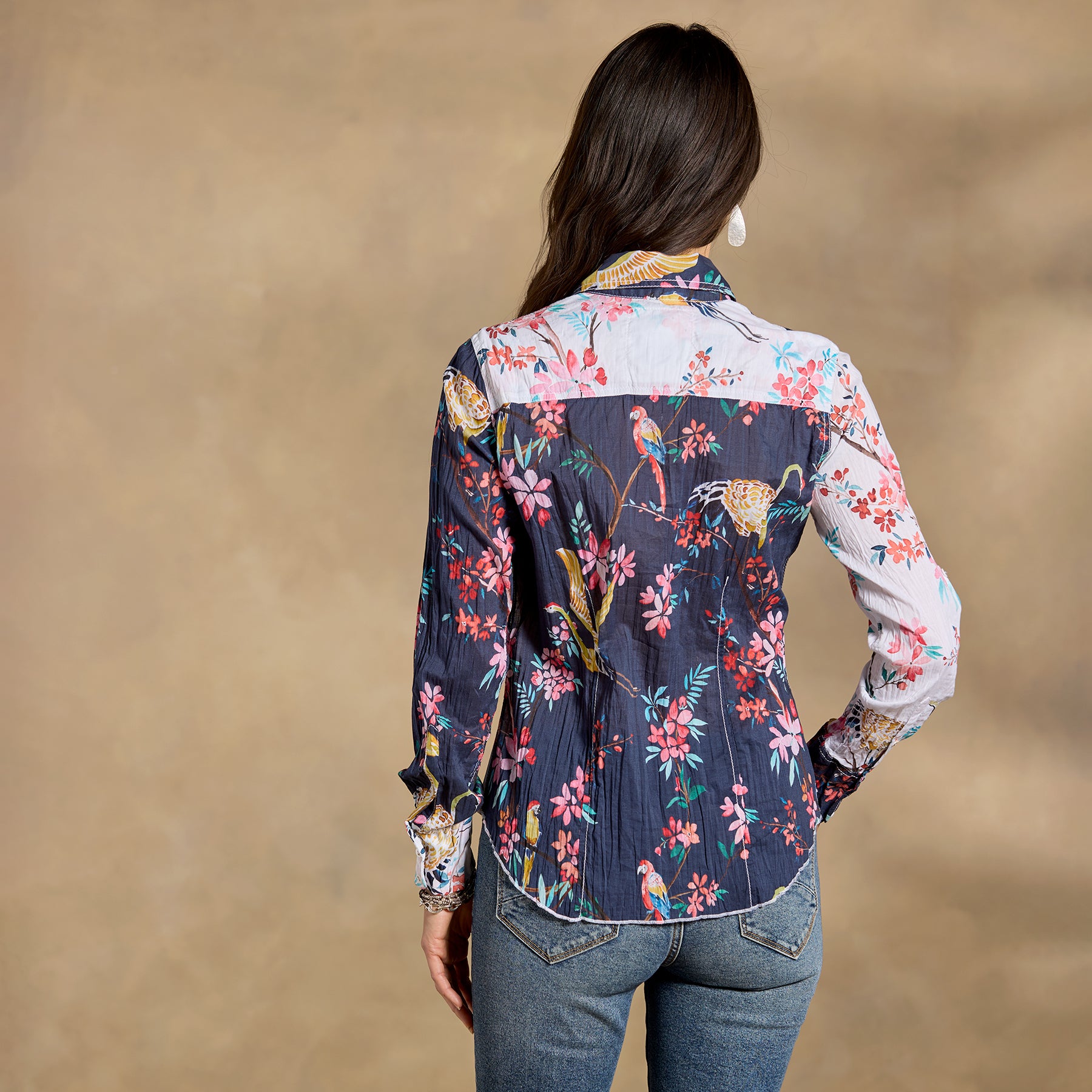 The beautiful gardens of Kyoto. Japan inspired the contrast prints on this light and airy crinkle cotton button-front shirt. Machine wash. Imported. Sundance exclusive. Sizes XS (0–2). S (4–6). M (8–10). L (12–14). XL (16–18). XXL (20–22). Approx. 27.88l.