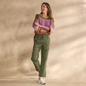 Overflowing with beautiful detail. our asymmetrical floral embroidered cargo pants feature a flattering Hollywood waist with two buttons. five pockets and a straight leg fit. Cotton/lycra. Machine wash. Imported. Exclusive. Sizes 2–16. 26.5 inseam.