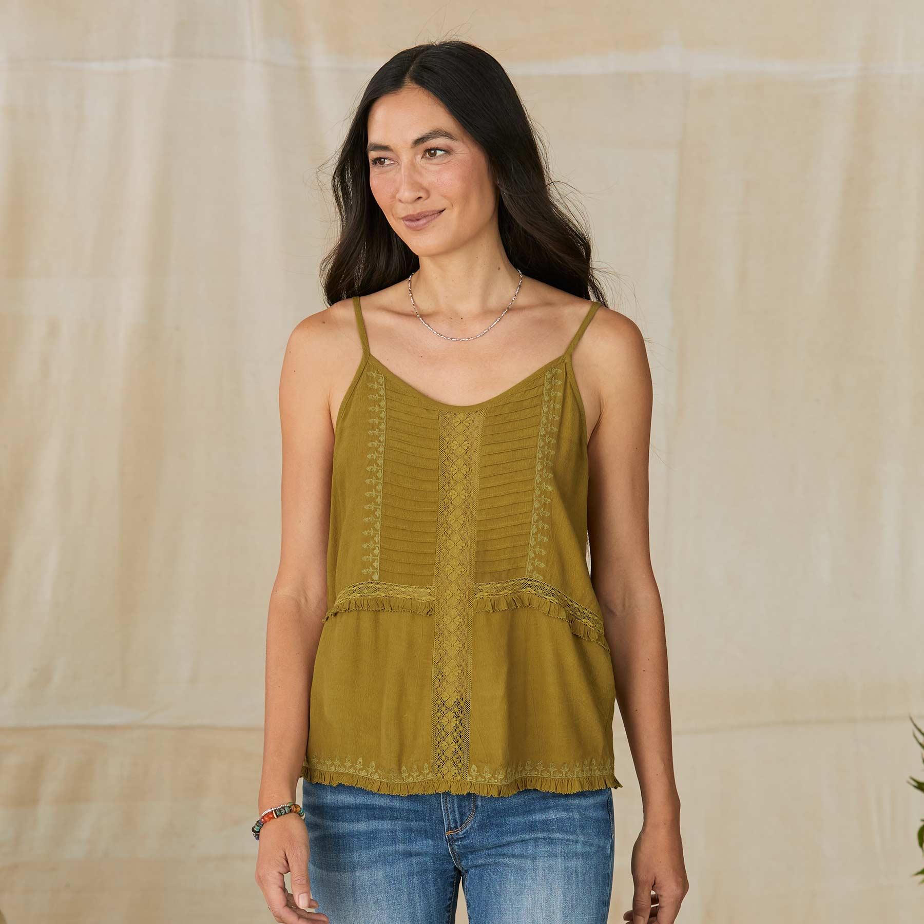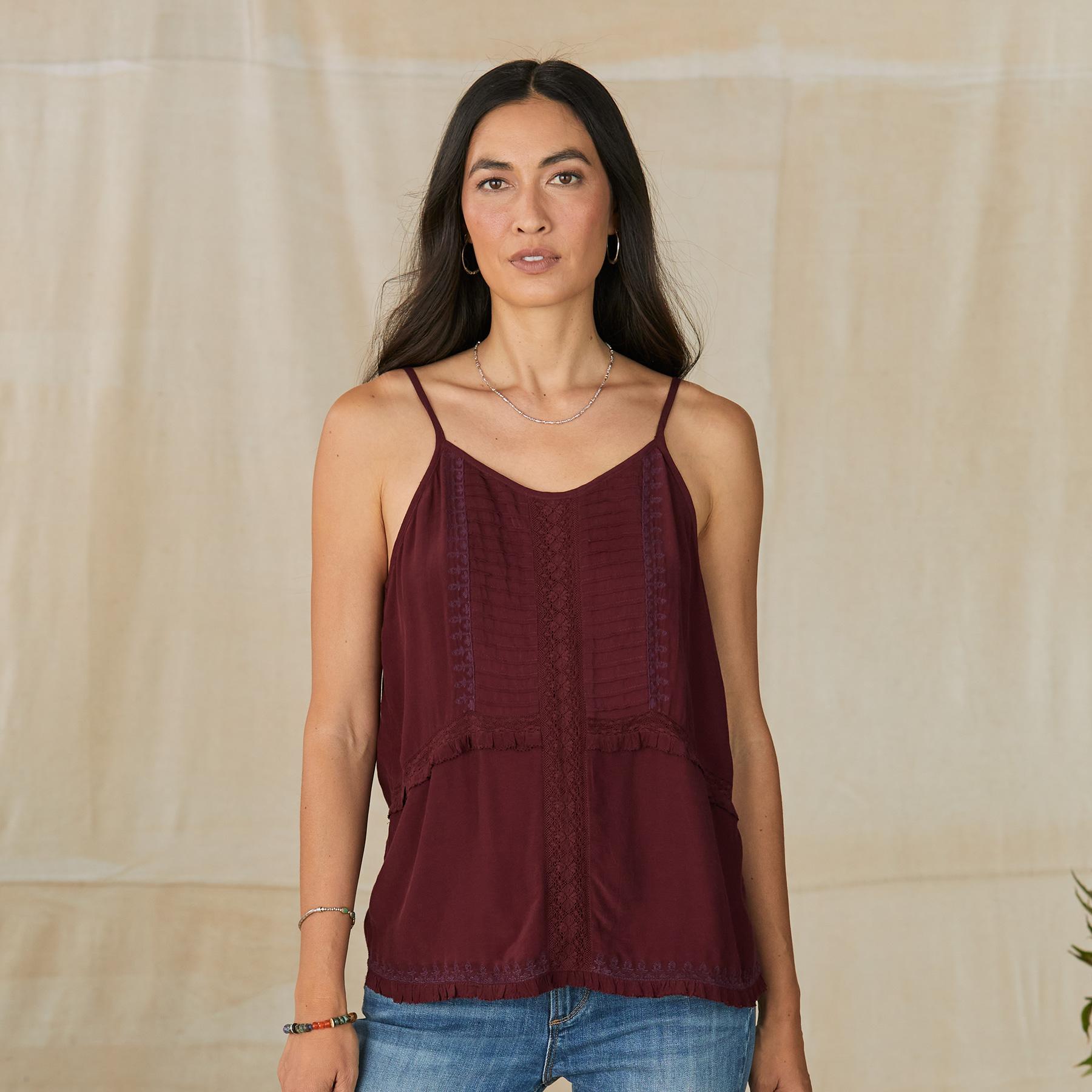 Drawing inspiration from vintage beauty. our lovely camisole is graced with lace insets. pintuck details. tonal embroidery and ruffles. Viscose. Machine wash. Imported. Exclusive. Sizes XS (0-2). S (4-6). M (8-10). L (12-14). XL (16-18). XXL (20-22). Approx. 24.5l.